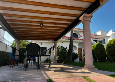Terraza con cubierta de pérgolado de madera y acabados en cantera para una residencia en el fraccionamiento Lomas de Cocoyoc, Morelos.