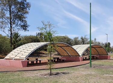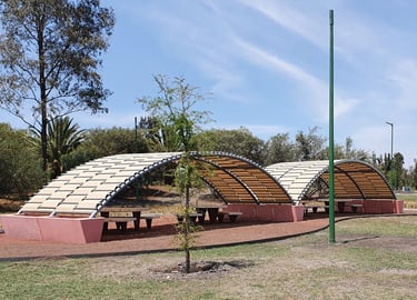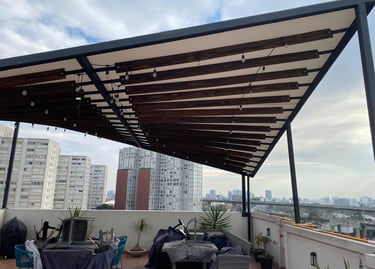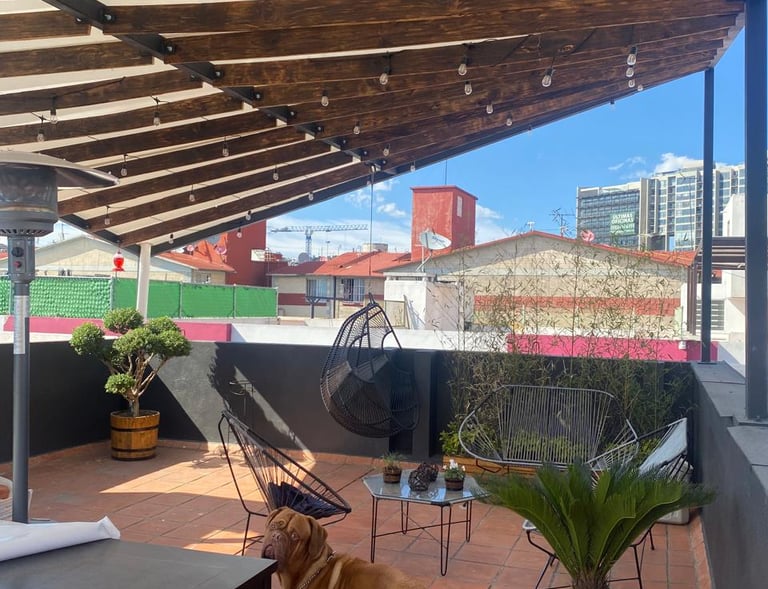 Roof Garden en departamento en CDMX con pergolado de madera en geometría de paraboloide hiperbólico.